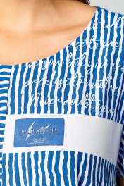 Платье свободного покроя с асимметричными горизонтальными подрезами и кокеткой. Кокетка декорирована печатью и нашивным элементом. Спинка с кокеткой. Рукав втачной одношовный короткий. Длина платья 115 см, длина рукава 22 см. Декоративная нашивка может отлечаться от фото.