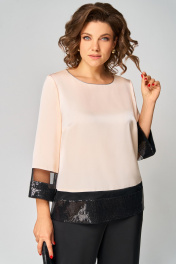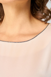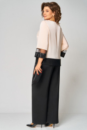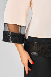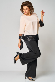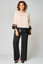 Комплект женский , двухпредметный состоящий из: туники и брюки. Туника прямого силуэта по переду прострочены нагрудные вытачки. Округлый вырез горловины , по горловине прострочен декоративный кант. Спинка со средним швом. Рукав втачной, двухшовный. Длина рукава – 20см, длина по спинке -62см.Низ рукава и туники выполнен из сетки и пайеток. Брюки прямые. Длина брюк по внутреннему шву - 77см. Брюки на поясе, по бокам резинка и косые карманы. Застёжка на тесьму-молнию и 1 пуговицу.