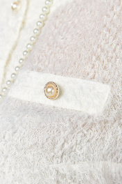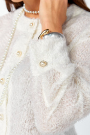 Элегантный женский комплект состоящий из блузки и юбки. Блузка полуприлегающего силуэта выполнена из шифона «травки». Округлый вырез горловины. По переду настрочен нагрудный карман обманка листочка с 1 пуговицей. Спинка со средним швом и талевыми вытачками. Рукав втачной, одношовный на притачной манжете, застежка на 1 пуговицу и петлю . Застежка центральная 5 пуговиц и петель. Юбка с завышенной талией заужена к низу на обтачке выполнена. По переднему полотнищу юбки настрочена карман «листочка». Сзади разрез и застежка на потайную тесьму-молнию. Юбка на подкладке.
