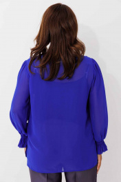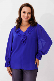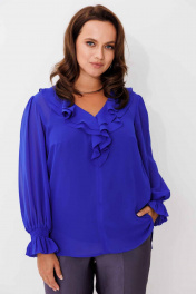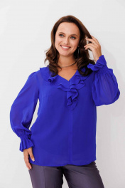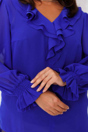 Блуза женская, рукав втачной со сборкой по окату. Рукав расширяется к низу. V-образный вырез с двойным воланом. Низ рукава обработан манжетой на венгерке. В комплекте топ из хлопковой ткани с регулируемыми бретелями.
