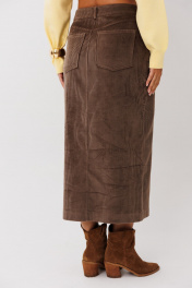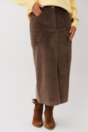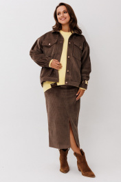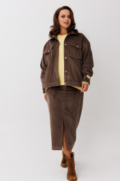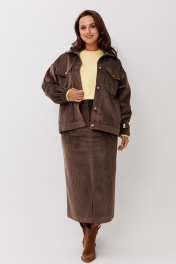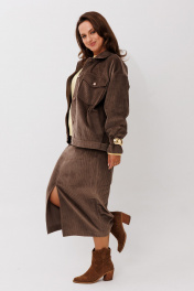 Комплект женский свободного силуэта состоит из бомбера и юбки. Бомбер со спущенными плечами застёгивается на прорезные петли и пуговицы. По переду прорезные карманы с широкой листочкой и накладные карманы с фигурными клапанами на застёжке. Воротник отложной. Рукава одношовные втачные на манжете. Юбка женская слегка зауженная к низу на притачном поясе со шлёвками, который застёгивается на прорезную петлю и пуговицу. По переду застёжка на молнию с гульфиком и откоском и карманы. По спинке центральный шов, заканчивающийся разрезом, кокетка и накладные карманы. Юбка и бомбер без подкладки.