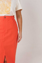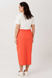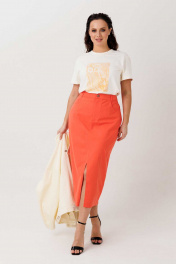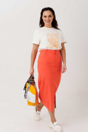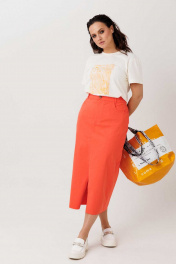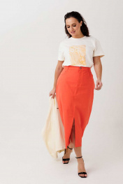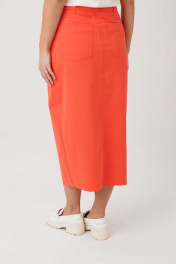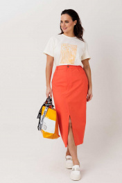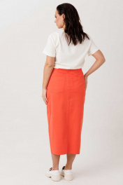 Юбка женская слегка зауженная к низу на притачном поясе со шлёвками, который застёгивается на прорезную петлю и пуговицу. По переду фигурный подрез заканчивается разрезом, застёжка на молнию с гульфиком и откоском и карманы. По спинке центральный шов, кокетка и накладные карманы. Юбка без подкладки. Украшают юбку двойные отделочные строчки.