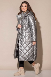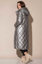 Пальто женское утеплённое осень-зима прямого силуэта с отстёгивающимся капюшоном, выполнено из ткани лаке на утеплителе изософт. По переду большие накладные карманы и застёжка на металлические кнопки. Низ пальто стягивается на шнур. Воротник стойка. Рукава одно шовные втачные. Подкладка простёгана с утеплителем изософт