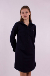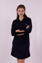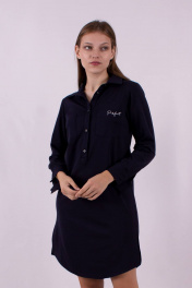 Длина изделия: 98 см Длина рукава: 63 см Платье прямого силуэта, с фигурными разрезами по бокам. Накладные карманы на груди с принтом. Длинный рукав на манжете. По спинке кокетка со встречным веером, принт. Застёжка планка на пуговицах. Отложной воротник.