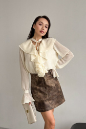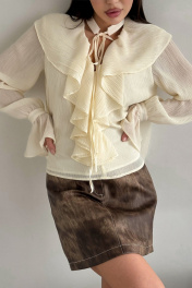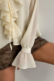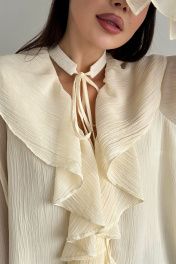 Блуза, декорированная рюшами. Воротник-чокер с завязками. Рукава с манжетами на застежку пуговицу. Длина блузы 58 см, длина рукава от воротника 85 см. ОГ 42-44 р-р 112-114 см, 46-48 р-р 120-122 см. Состав 68% ПЭ, 28% вискоза, 4% спандекс.