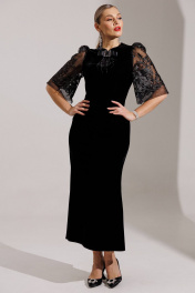 Новинка от бренда Мода-Юрс - велюровое платье в тандеме с гипюром. Черный цвет в одежде - символ утонченности и роскоши. Платье подчеркивает женственные линии фигуры и не оставит шанса не влюбиться! Платье полуприлегающего силуэта с рельефами по переду и талиевыми вытачками по спинке. Рукав втачной, по окату со сборкой, к низу расширен. По переду платье со стойкой, которая застегивается на навесную петлю и пуговицу и на крючок внутри. длина рукава: 43 см длина спинки: 135 см