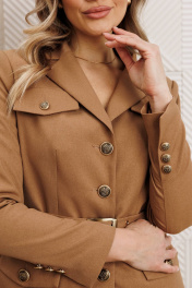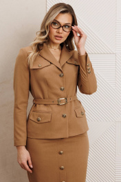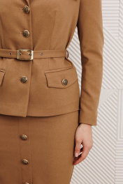 Комплект, состоящий из жакета и юбки. Жакет полуприлегающего силуэта с центральной застежкой на петли-пуговицы. Спинка со средним швом. По переду – талиевые вытачки, карманы с клапаном и декоративные клапаны в области груди. Воротник пиджачного типа. Рукава втачные, двухшовные. Локтевой шов заканчивается отлетной шлицей с декором из ряда пуговиц. Жакет на подкладке. Жакет дополнен съёмным поясом с пряжкой. Юбка-карандаш - воплощение классической офисной элегантности. Ее строгий силуэт, подчеркивающий линию бедер, создает безупречно профессиональный образ. Юбка зауженная к низу. Изюминка дизайна спереди: элегантная шлица, декорированная аккуратной отделкой из пуговиц. Эта деталь не только добавляет динамику и визуальный интерес, но и обеспечивает свободу движения. Боковая застежка-молния обеспечивает аккуратную посадку и легкое надевание, сохраняя чистоту линий спереди и сзади. Притачной пояс с резинкой сзади. На подкладке. Такая юбка является не просто базовой вещью, а законченным стильным акцентом Вашего делового гардероба. Она безупречно сочетается с блузами, жакетами и топами, создавая элегантный и уверенный ансамбль. длина жакета: 63 см длина юбки: 84 см