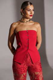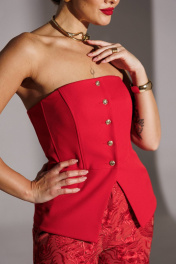 Капсула RED CODE - Ваша формула смелого праздника. Она создана для особых случаев включает в себя жакет, корсет и брюки, создавая элегантный и стильный образ. Корсет приталенного силуэта с центральной застежкой на пуговицы, идеально подчеркивающий фигуру и создающий элегантный контур. В вертикальные рельефы по переду и спинке, а также в боковые швы вставлен регилин, что обеспечивает дополнительную поддержку и формирует красивую линию талии. Низ корсета имеет фигурную форму, добавляя изысканности и утонченности. Корсет выполнен на подкладке, что гарантирует комфорт при носке и улучшает посадку на теле. Мы собрали все элементы новогодней коллекции в единую капсулу, где каждая вещь - не просто предмет гардероба, а часть большой стилистической головоломки. Собирайте образы как конструктор, меняйтесь в течение вечера и будьте неотразимы в каждой роли! длина спинки корсета: 33 см