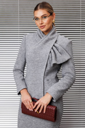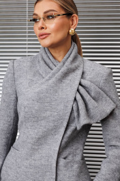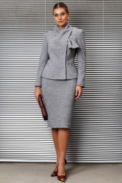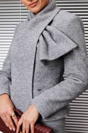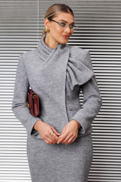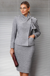 Комплект женский, состоящий из жакета и юбки. Жакет полуприлегающего силуэта с рельефами по переду и спинке. Полочка с карманами от рельефа до бокового шва. Застежка на кнопки и в верхней части на петли-пуговицы. В жакете оригинально оформлена линия горловины - в виде драпирующегося шарфа, что позволяет использовать его в прохладную погоду в качестве верхней одежды. Юбка прямая, зауженная к низу, сверху на притачном поясе с резинками. Застежка на тесьму-молнию в среднем шве, которая переходит в шлицу. Костюм на подкладке. длина жакета: 60 см длина рукава: 61 см длина юбки: 69 см