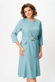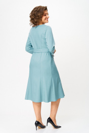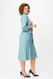 Платье женское полуприлегающего силуэта, расширенное к низу, без подкладки, тесьма-молния в среднем шве спинки. Перед и спинка с рельефами от проймы. Вырез горловины переда фигурный V-образный. На боковой части переда на уровне ниже линии талии, пришит закругленный клапан, закреплен по краям двумя пуговицами. Спинка со средним швом. Горловина обработана обтачками. Рукав втачной, одношовный. В дополнении пояс из основной ткани, фиксируется пряжкой.