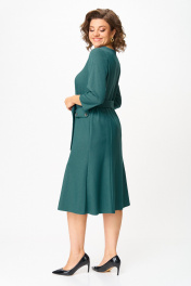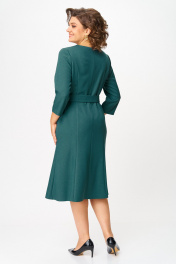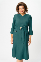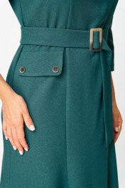 Платье женское полуприлегающего силуэта, расширенное к низу, без подкладки, тесьма-молния в среднем шве спинки. Перед и спинка с рельефами от проймы. Вырез горловины переда фигурный V-образный. На боковой части переда на уровне ниже линии талии, пришит закругленный клапан, закреплен по краям двумя пуговицами. Спинка со средним швом. Горловина обработана обтачками. Рукав втачной, одношовный. В дополнении пояс из основной ткани, фиксируется пряжкой.