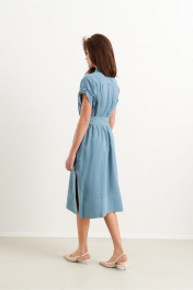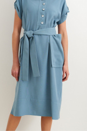 Платье прямого силуэта из смесовой ткани. Длина платья до середины икры. Рукав платья втачной спущенный закрепляется на пату с пуговицей. По переду платья обработана застежка на петли пуговицы. По спинке отрезная кокетка. Накладные карманы переходящие, располагаются в раоне бедра. Низ платья и разрезы обрботаны отрезными декоративными деталями. В комплект к платью рилагается съемный пояс.