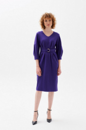 Платье со спущенной линией плеча, полуприталенного силуэта,зауженное к низу,из однотонной трикотажной ткани,длиной до середины икры. Спинка со средним швом с молнией,снизу разрез-шлица. По переду средний шов,по талии по два защипа. Рукав длиной 7/8,прямой объёмный,по низу застрочены глубокие защипы. Горловина платья с V-образным вырезом,обработана обтачками. В боковых швах карманы. К платью прилагается съёмный пояс-завязка на полукольцах.