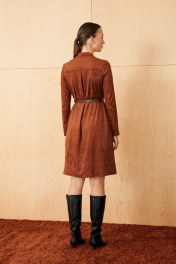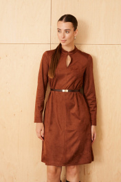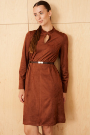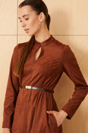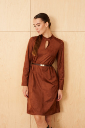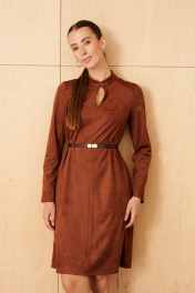 Платье из эко замши на трикотажной основе Maiga А-силуэта, длиной чуть выше колена. Воротник-стойка с застежкой на крючек. Вырез щелеобразный в центральном шве переда, а так-же выполнены кокетки. Рукав втачной, полной длины, внизу в шве потайная застежка молния. По спинке кокетка и встречная складка.
