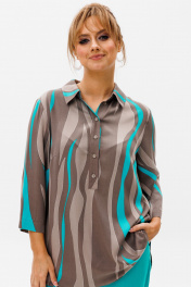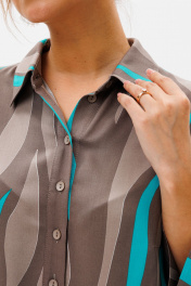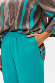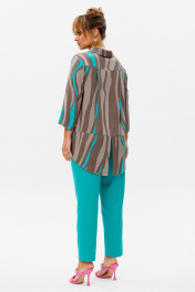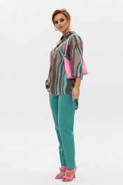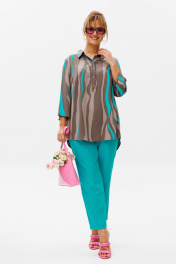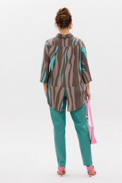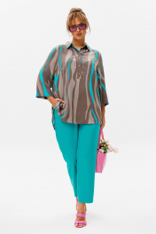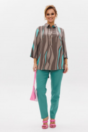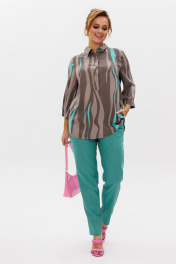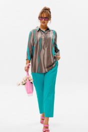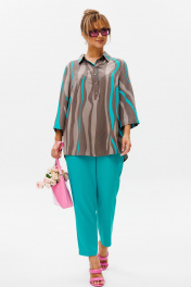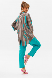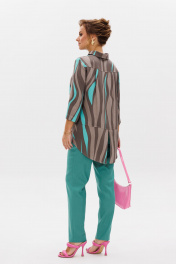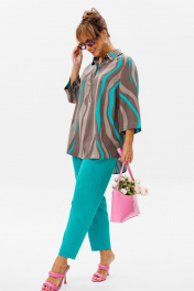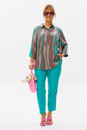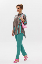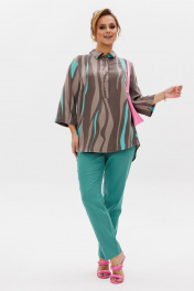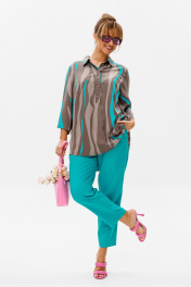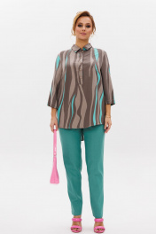 Стильный женский комплект состоит из блузы и брюк. Блуза свободного силуэта, выполненная из легкой струящейся ткани (не тянется) с модным принтом. По переду центральная застежка на петли-пуговицы. По спинке отрезная кокетка, от которой заложена складка для свободы движения. В нижней части спинки горизонтальный подрез с разрезом по середине. Низ блузы фигурной формы. Горловина оформлена рубашечным воротником со стойкой. Рукав втачной, одношовный, длиной ¾. Длина блузы по среднему шву спинки – р46,48,50 – 78, р52,54,56 – 80, р58,60,62 – 82 Длина рукава – р46,48,50 – 45, р52,54,56 – 45, р58,60,62 - 46 Ширина рукава на уровне глубины проймы ½ - р46 – 19, р48 – 19,5, р50 – 20, р52-20,5, р54-21, р56-21,5, р58-22,5, р60-23, р62-23,5 Ширина рукава внизу ½ -р46-18, р48 – 18,5, р50 – 19, р52-19,5, р54-20, р56-20,5, р58-21,5, р60-22, р62-22,5 ОГ ½ - р46 – 57, р48 – 59, р50-61, р52-63, р54-65, р56-67, р58-69, р60-71, р62-73 ОТ ½ - р46-58, р48-60, р50-62, р52-64, р54-66, р56-68, р58-70, р60-72, р62-74 ОБ ½ - р46-59, р48-61, р50-63, р52-65, р54-67, р56-69, р58-71, р60-73, р62-75 Брюки свободного прямого кроя с высокой посадкой, в боковых швах наклонные карманы. Верхний срез оформлен поясом с эластичной резинкой. Длина брюк по боковому шву во всех р-ах – 109 Длина брюк по внутреннему шву во всех р-ах -80 Ширина брюк внизу ½ - р46-16, р48-17, р50-18, р52-19, р54-20, р56-21, р58-22,5, р60-23, р62-23,5 ОТ ½ с раст резинкой (макс) –р46-47, р48-49, р50-51, р52-53, р54-55, р56-57, р58-59, р60-61, р62-63 ОБ ½ - р46-54, р48-56, р50-58, р52-60, р54-62, р56-64, р58-66, р60-68, р62-70 Высота посадки брюк спереди – р46,48,50 – 31,5, р52,54,56 – 32,5, р58,60,62 – 33,5 Высота посадки брюк сзади – р46,48,50 – 47, р52,54,56 –48, р58,60,62 - 49
