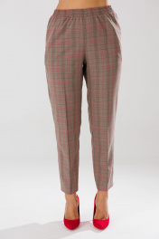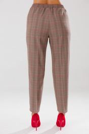 Стильный женский костюм, состоящий из жакета и брюк, выполненный из костюмной ткани в клетку (не тянется). Жакет полуприлегающего силуэта без подкладки. По переду рельефные швы, наклонные накладные карманы, центральная застежка на петли-пуговицы. Горловина оформлена рубашечным воротником. Спинка со средним швом. Рукава втачные одношовные, длиной ¾ с отложной манжетой, с разрезом посередине. Длина жакета по среднему шву спинки – р46,48,50 – 64, р52,54,56 – 65 Длина рукава во всех р-ах – 45 Ширина рукава на уровне глубины проймы ½ - р46-18,5, р48-19, р50-19,5, р52-20, р54-20,5, р56-21 ОГ ½ - р46-52, р48-54, р50-56, р52-58, р54-60, р56-62 ОТ ½ - р46-50, р48-52, р50-54, р52-56, р54-58, р56-60 ОБ ½ - р46-55, р48-57, р50-59, р52-61, р54-63, р56-65 Брюки прямого кроя с высокой посадкой, зауженные к низу. В боковых швах наклонные карманы. Верхний срез оформлен поясом с эластичной тесьмой. Длина брюк по боковому шву – р46,48,50 – 101, р52,54,56 – 103 Длина брюк по внутреннему шву – р46,48,50 – 73, р52,54,56 – 73 Ширина брюк внизу 1/2– р46-17,5, р48-18, р50-18,5, р52-19, р54-19,5, р56-20 ОТ с растянутой резинкой (макс)1/2 – р46-50, р48-52, р50-54, р52-56, р54-58, р56-60 ОБ ½ - р46-51, р48-53, р50-55, р52-57, р54-59, р56-61 Высота посадки брюк спереди – р46,48,50 – 28,5, р52,54,56 – 30,5 Высота посадки брюк сзади – р46,48,50 – 43,5, р52,54,56 – 45,5 Обхват бедра – р46-64, р48-66, р50-68, р52-70, р54-72, р56-74
