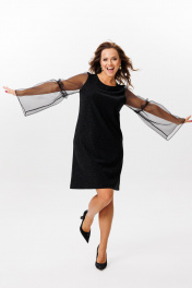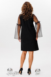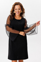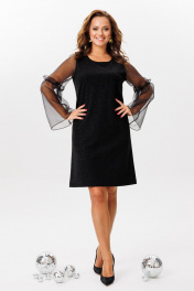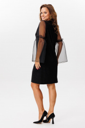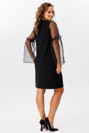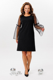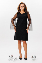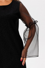 Нарядное платье, выполненное из двух видов ткани: крепа с тоненькой нитью люрекса на трикотажной основе (тянется) и органзы (не тянется). Платье А-силуэта. Спинка со средним швом. Горловина округлой формы, обработана окантовкой. Рукава втачные, одношовные, отрезные выше линии локтя, нижняя часть присборена, имитируя рюшу. Платье без подкладки.