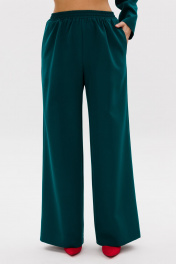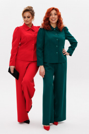Стильный женский костюм, состоящий из жакета и брюк, выполнен из костюмной ткани (тянется). Жакет полуприлегающего силуэта на подкладке. По переду рельефные швы, отрезной бочок, функциональные карманы в рельефных швах, фигурные отделочные строчки. Застежка центральная на петли-пуговицы. Спинка с рельефными и средним швами. Горловина оформлена рубашечным воротником. Рукава втачные одношовные с присборенным окатом в виде рюши. Брюки свободного прямого кроя с высокой посадкой. В боковых швах функциональные карманы. Верхний срез оформлен поясом с эластичной резинкой.