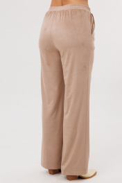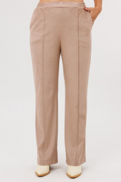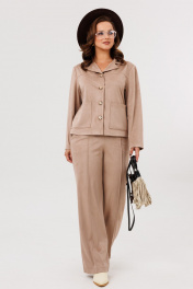 Стильный женский костюм, состоящий из жакета и брюк, выполненный из костюмной ткани «Замша» (тянется). Полотно мягкое, очень комфортное. Жакет прямого силуэта со спущенной линией плеча. По переду отрезные кокетки, накладные карманы. Застежка центральная на петли-пуговицы. Горловина оформлена воротником пиджачного типа с лацканом. Спинка с отрезной кокеткой, нижняя часть со средним швом. Рукава втачные, двухшовные. Жакет без подкладки. Брюки прямого кроя с высокой посадкой. По передним половинкам вертикальная застроченная складка на 0,5 см, в боковых швах наклонные карманы. Верхний срез оформлен поясом с эластичной резинкой.