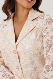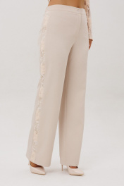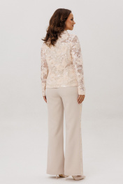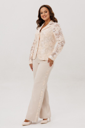 Нарядный женский костюм, состоящий из жакета и брюк, выполненный из костюмной ткани (тянется) и из гипюра с вышивкой и пайетками (не тянется). Жакет полуприлегающего силуэта, нижние части переда и спинки на подкладке, кокетка и рукава без подкладки. По переду нагрудные вытачки, центральная застежка на петли-пуговицы. По спинке талиевые вытачки. Горловина оформлена воротником пиджачного типа с лацканом. Рукава втачные двухшовные. Брюки с высокой посадкой, немного с расширением от колена к низу. По срезу банта – застежка-молния. По боковым швам лампасы из гипюра. Верхний срез оформлен поясом с эластичной резинкой по задней половинке.