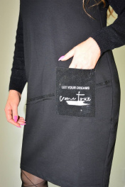 Платье женское из 2 видов материалов: основной - мягкий эластичный однотонный футер двухнитка, в состав которого входит хлопок ; отделка — однотонный вязаный трикотаж с ворсом и деликатным вплетением из люрексовой нити . Платье полуприлегающего силуэта, повседневное , в стиле спорт-шик, со съемным воротником-хомутом по типу «снуд», с втачным покроем рукава. Перед на груди с аппликацией из термостраз, с косым подрезом по линии бёдер, по открытому срезу которого нанесена аппликация из термостраз, с накладным карманом, по которому нанесена трафаретная печать и аппликация из термостраз. Спинка цельная. Рукава одношовные, длинные, низ рукава оформлен манжетой из вязаной резинки. Округлый вырез горловины обработан бейкой. !!! Чтобы изделия со стразами прослужили своей красотой долгое время) рекомендуем следующий уход : - соблюдаем температурный режим стирки, указанный на ярлыке (не выше 40 С) - стираем изделие, вывернув его на изнанку - п осле стирки до полного высыхания не тереть, не выкручивать и не выжимать изделие - гладим изделие только с изнаночной стороны, соблюдая температурный режим, указанный на ярлыке