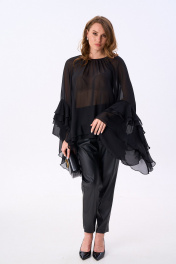 Блуза свободного силуэта с присборенной горловиной, обработанной бейкой. Спинка со средним швом, переходящим в разрез. Рукава реглан с асимметричными воланами. Нижний край блузы с двойным воланом.