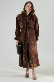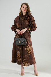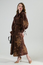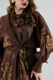 Платье состоит из двух платьев: верхнего и нижнего. Верхнее платье с авторским арнаментом свободного кроя длиной миди с цельнокроеным рукавом и подрезом по линии талии. Перед со средним швом, переходящим в V-образный вырез горловину и разрез от середины бедра. В верхней части переда выполнены рельефные швы до уровня подреза. Объем по линии талии регулируется завязками, закрепленными в рельефных швах переда.Средняя часть переда переходит в стойку. По низу рукавов складки и манжеты с завязками. Низ и разрез обработаны широкой подгибкой с закрытым срезом. Нижнее платье комбинация на регулируемых бретелях. В комплект к изделию идет авторская брошь в виде цветка ручной работы. Лимиированная серия.