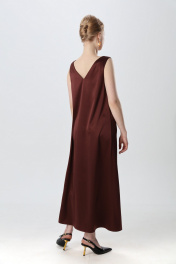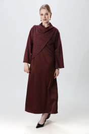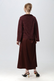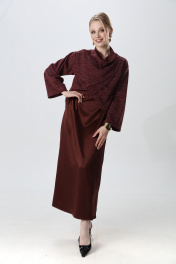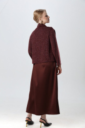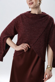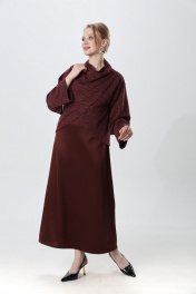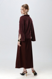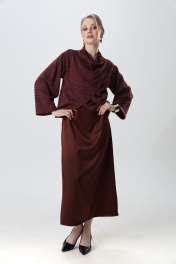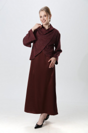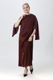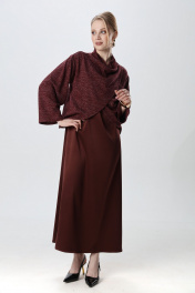 Костюм двухпредметный: состоит из джемпера и платья. Элегантный укороченный джемпер-кейп прямого свободного силуэта с округлой горловиной и фигурным лифом. Рукав втачной широкий, от линии локтя до запястья есть дополнительное отверстие для рук. Платье прямого силуэта, с небольшим расширением к низу, длиной макси. Перед с нагрудной вытачкой из бокового шва. Вырез горловины переда и спинки имеют V-образную форму.