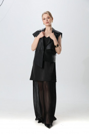 Костюм двухпредметный: состоит из платья и жилета. Платье прямого силуэта, с небольшим расширением к низу, длиной макси. Перед с нагрудной вытачкой из бокового шва. Вырез горловины переда и спинки имеют V-образную форму. Низ платья декорирован воланом из гофрированного шифона. Жилет из экокожи прямого силуэта с воротником пиджачного типа. По правой пройме переда расположена фигурная деталь "крылышко". Спинка со средним швом. По низу правого переда и низу правой спинки фигурная деталь. По левой части переда и левой части спинки отлетная кокетка. Изделие идёт в комплекте с ремнем из экокожи.