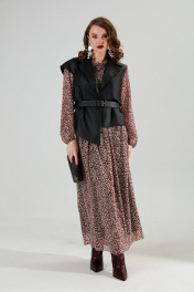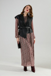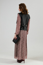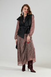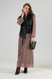 Костюм двухпредметный: состоит из платья и жилета. Платье макси прямого силуэта с V-образным вырезом, отрезное по линии талии. Горловине с имитацией чокера, застёжка на петлю и декоративную пуговицу. Рукав немного приспущен, по низу собран на манжет с петлей и пуговицей. Изделие на подкладке. Жилет из экокожи прямого силуэта с воротником пиджачного типа. По правой пройме переда расположена фигурная деталь "крылышко". Спинка со средним швом. По низу правого переда и низу правой спинки фигурная деталь. По левой части переда и левой части спинки отлетная кокетка. Изделие идёт в комплекте с ремнем из экокожи.