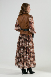 Жилет двубортный с отложным воротником на отрезной стойке, умеренного объема, прямого силуэта с застежкой на петли и пуговицы. Талия фиксируется съемным ремнем из экокожи, для которого в боковых швах оформлены шлевки. Ремень идёт в комплекте к изделию.