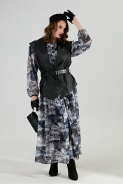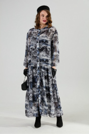 Платье состоит из двух платьев: верхнего и нижнего. Верхнее платье макси свободного кроя прямого силуэта. Центральная застежка на петли и пуговицы. Спинка присборена в верхней части, с притачной кокеткой. Горловина оформлена воротником-стойкой. Объемный втачной рукав со спущенной проймой, присбореный по окату. По низу платья широкая отрезная оборка с густой сборкой. Нижнее платье-комбинация на регулируемых бретелях.
