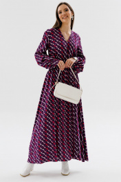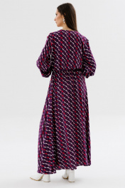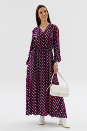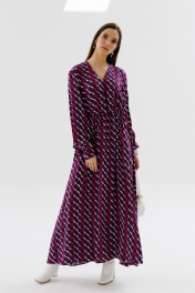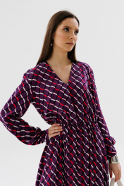 Уютное платье приталенного силуэта отрезное по линии талии, с расширением к низу. Нижняя часть переда и спинки расширенной формы, со средним швом. Сборка по линии талии образуется с помощью эластичной тесьмы. Рукав втачной, одношовный, длинный. Нижний срез рукава со сборкой и разрезом, обработан притачной манжетой, застёгивается на петлю и пуговицу. Горловина переда имеет V -образный вырез. Изделие идёт без подкладки.