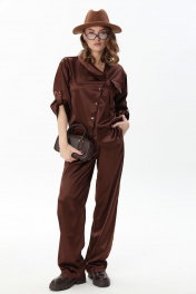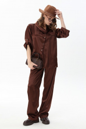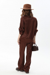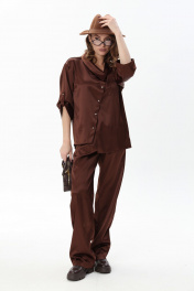 Брюки свободного кроя из гладкой ткани сочетают элегантность и комфорт. Широкая резинка на поясе и наличие функциональных карманов подчеркивают удобство модели.