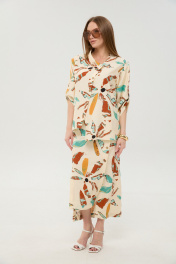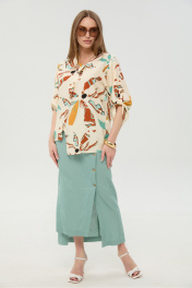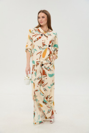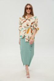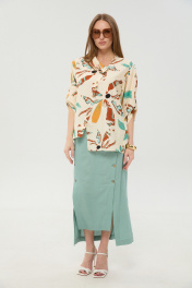 Жакет рубашечного типа прямого силуэта с асимметричным низом. Рукав втачной со спущенной линией плеча, фиксируется на пату. Застежка центральная на петли и пуговицы, смещённая по косой. Воротник отложной на стойке до половины спинки.