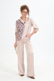 Жакет рубашечного типа прямого силуэта с асимметричным низом. Рукав втачной со спущенной линией плеча, фиксируется на пату. Застежка центральная на петли и пуговицы, смещённая по косой. На левой полочке накладной карман с клапаном. Воротник отложной на стойке до половины спинки.
