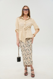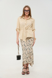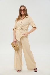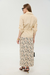 Жакет прямого силуэта, воротник пиджачного типа, рукав одношовный, втачной с незначительно спущенной линией плеча, длиной три четверти, с патой. По линии ткани настрачная кулиса с завязками из основной ткани. Застежка центрально-бортовая. Линия низа верхней части фигурная ассиметричная.