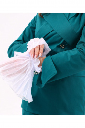 Костюм трёхпредметный: состоит из жакета и юбки, съёмных гофрированных манжет. Жакет полуприлегающего силуэта с втачными длинными прямыми рукавами. Перед с двумя нагрудными вытачками, переведенными в подрез, переходящий в боковой горизонтальный карман с клапаном и двумя обтачками и верхним наклонным карманом с листочкой, со смещённой застежкой на петли и пуговицы. Спинка со средним швом, двумя талевыми вытачками и отрезным бочком. Воротник пиджачного типа с заострёнными концами, направленными вверх, с лацканами, переходящими в пояс, застегивающимися сзади на пуговицу. Изделие на подкладке. Юбка прилегающего силуэта, зауженная к низу, длиной ниже колена с высоким разрезом по центру и застежкой на тесьму- молнию. Переднее полотнище юбки с рельефами, наклонно к которым расположены карманы.