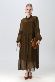 Платье состоит из двух платьев: нижнего и верхнего. Верхнее платье макси с центральной отрезной застёжкой на потайную планку на петли и пуговицы.По переду и спинке цельнокроеные складки на уровне талии. Рукав втачной,одношовный рубашечноно типа. По низу рукава пробиты петли и вставлена завязка для фиксации сборки . Воротник рубашечный стояче отложной. Нижнее платье комбинация на регулируемых бретелях.