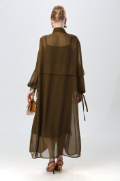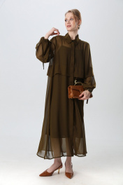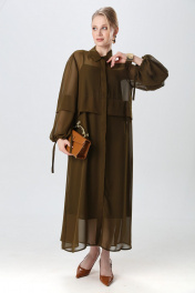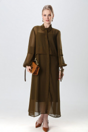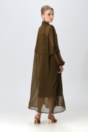 Прозрачное платье макси с центральной отрезной застёжкой на потайную планку на петли и пуговицы.По переду и спинке цельнокроеные складки на уровне талии. Рукав втачной,одношовный рубашечноно типа. По низу рукава пробиты петли и вставлена завязка для фиксации сборки . Воротник рубашечный стояче отложной. Внимание! Нижнее платье в комплект не входит.