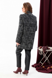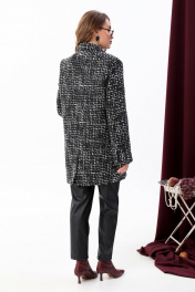 Костюм двухпредметный: состоит из жакета и брюк. Жакет оверсайз прямого силуэта на подкладке. Застежка бортовая на петли и пуговицы. Детали переда с двумя вытачками и с карманами. Карман прорезной с обтачками и клапаном. Карман с наклонным входом, прорезной, с листочкой. Спинка со средним швом. В среднем шве спинки шлица. Рукав втачной, длинный, двухшовный, с открытой шлицей в локтевом шве. Воротник английский с отрезной стойкой. Брюки с притачным поясом и с карманами в боковых швах.