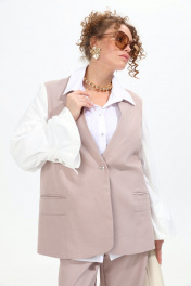 Жакет комбинированный оверсайз прямого силуэта. Застежка центральная на петлю и пуговицу. В изделии спроектирована имитация лацканов и воротника с отрезной стойкой. Боковой шов отсутствует. Перед с прорезными карманами. Спинка со средним швом. Рукав втачной двухшовный, с открытой шлицей в локтевом шве. В нижней части рукава расположены складки-защипы.