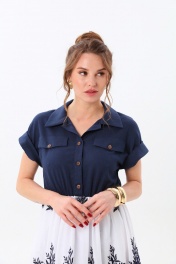 Комбинированное платье, состоящее из лифа и юбки. Лиф прямого кроя с коротким цельнокроеным рукавом с манжетой. Горловина обработана рубашечным воротником с отрезной стойкой. Застёжка центральная на петли и пуговицы.По полочке имитация нагрудных карманов с клапанами. Линия талии собрана на резинку. Юбка А-силуэта с уникальной вышивкой на подкладке.