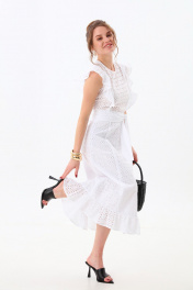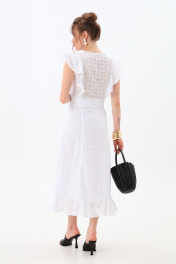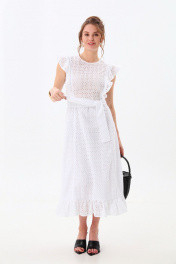 Платье прилегающей силуэтной формы, отрезное по линии талии, с застёжкой-молнией в боковом шве. Верхняя передняя часть платья и спинка с рельефными швами и отделочными воланами, переходящими в рукав-крылышко. Передняя и задняя части юбки с рельефными швами и оборкой по нижнему срезу. Вырез горловины и срезы пройм окантованы бейками. Линия талии платья подчёркивается длинным поясом, завязывающимся на бант.