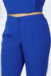 5733 Комплект брючный, 2-х предметный, (блуза, брюки) Этот брючный костюм - идеальное сочетание стиля и удобства. Благодаря элегантному дизайну и сдержанному стилю он подходит как для деловых встреч и рабочего дня, так и для торжественных мероприятий. Комплект брючный, 2-х предметный, состоящий из блузы и брюк, выполненных из костюмно-плательной ткани. Блуза полуприлегающего силуэта, с асимметричным передом, с нагрудной вытачкой, выходящей из правой проймы, с левым рельефом, идущим через центр груди от левого плеча вниз, с отлетной планкой в рельефе, идущей от левого плеча и расходящейся к низу А-образным разрезом. Правая боковая часть переда по разрезу и низа переда обработаны притачными планками. Спинка с талиевыми вытачками, со средним швом, в верхней части которого расположена застежка на потайную тесьму-«молнию», с притачной планкой по низу. Длина бузы по среднему шву спинки 72 см. Перед и спинка на трикотажной подкладке. Горловина переда и спинки округлая, по переду углубленная. Рукава втачные, одношовные. Длина рукава 45,5 см. Изделие с плечевыми накладками и с декоративной брошкой. Брюки классические, с посадкой на талии, на притачном поясе, с застёжкой на тесьму-«молния», расположенную в среднем шве передних половинок, и 1 петлю и 1 пуговицу на поясе. Передние и задние половинки брюк с талиевыми вытачками, идущими от пояса вниз, с заутюженными стрелками. Для лучшего прилегания брюк в области талии в поясе со стороны спинки вставлена резинка.