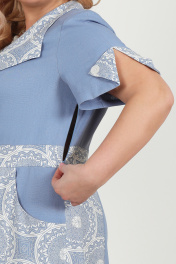 5958 Платье женское Платье женское полуприлегающего силуэта, расклешенное к низу, отрезное по линии талии, выполнено из ткани лен в сочетании однотонной и принтованной ткани. Длина по середине спинки 109 см. Перед с воротником «апаш». Воротник, центральная часть, отрезной пояс, бант, боковые части юбки из отделочной ткани принт. Средние, боковые части переда, центральная часть юбки, бочки карманов выполнены из однотонного льна. Перед с рельефными швами, выходящими из проймы и идущими вниз до пояса. Юбка переда с карманами, обработанными в боковых частях, с 8-ю пуговицами, расположенными на центральной части вдоль рельефных швов. По центру пояса закреплен бант. Верхняя часть спинки и центральная часть юбки спинки выполнены из однотонного льна, пояс и боковые части юбки выполнены из отделочной ткани принт. Спинка со средним швом до пояса, с талиевыми вытачками, идущими от пояса вверх. В левом боковом шве расположена застежка на потайную тесьму-молнию. Рукава втачные, с нижним и верхним швами. В верхнем шве на расстоянии 11 см от низа обработан разрез с 2-мя отделочными треугольными деталями. Отделочные детали закреплены на рукав 2-мя пуговицами. Рукава выполнены из однотонной ткани, отделочные треугольные детали из ткани принт. Длина рукава 26 см. Платье с плечевыми накладками.