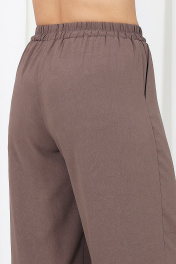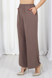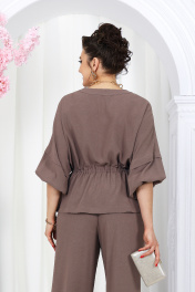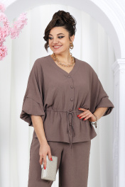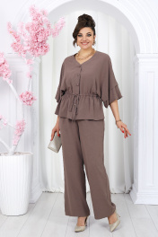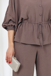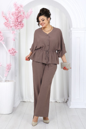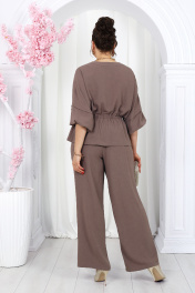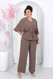 6056 Комплект брючный Этот костюм станет отличным выбором как для повседневных образов, так и для особых случаев. Свободный крой и струящаяся ткань создают легкий силуэт, подчеркивая женственность. Свободная блуза с V-образным вырезом и рукавами ¾ добавляет легкости и изящества. Завязка на талии регулирует посадку, акцентируя фигуру. Прямые брюки с высокой посадкой визуально вытягивают силуэт. Комплект брючный 2-х предметный, состоящий из блузки и брюк. Блузка прямого силуэта, выполнена из крэш-полотна. Модель без воротника, без плечевых накладок, со спущенной линией плеча. Блузка отрезная по линии талии, в шве обработана кулиса с пояском из основной ткани. Перед с центральной застежкой по отрезным планкам на 5 петель и 5 пуговиц. Круглая горловина спинки обработана отрезной фигурной бейкой. Рукав трехчетвертной, со сборкой вдоль притачной манжеты; для регулирования длины рукава внутрь манжеты протянута широкая эластичная лента, зафиксированная посередине отделочной строчкой. Над швом втачивания рукава заутюжена складка шириной 2 см и закреплена отделочной строчкой. Длина блузки – 60 см (44-52 р-р), 61 см (54-58 р-р); длина рукава (от горловины) –59 см (44-46 р-р), 60 см (48-52 р-р), 62 см (54-58 р-р). Брюки классические, длинные, с посадкой на талии, выполнены из крэш--полотна. Модель без стрелок, без застежки. Спереди обработаны наклонные боковые карманы. Для лучшего прилегания по линии талии в притачном поясе предусмотрена эластичная лента, вставленная по всей длине. Длина брюк по боковому (с поясом) – 105 см (44-46 р-р), 106 см (48-52 р-р), 107 см (54-58 р-р).