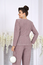 6070 Комплект брючный Это не просто наряд — это ваша уверенность, статус и блеск, который будет сопровождать каждый ваш шаг. В этом костюме каждая деталь продумана так, чтобы создавать ощущение безупречного стиля и лёгкой роскоши. Мягкое мерцание люрекса делает образ выразительным и дорогим, а утончённый крой подчёркивает женственность и гармонию силуэта. Блузка с асимметричной деталью по линии талии — это модный акцент, который визуально формирует стройный силуэт и придаёт образу дизайнерскую изысканность. Нежная линия декольте в обрамлении округлой горловины элегантно подчёркивает женственность. Брюки прямого силуэта с комфортной посадкой — символ утончённой простоты и свободы. Эластичный пояс обеспечивает удобство, а мерцающая фактура ткани делает их достойным элементом вечернего гардероба. Такой костюм создан для особых случаев: новогодних вечеров, корпоратива, праздничного ужина или выхода в свет, но при этом он настолько универсален, что легко впишется и в деловой стиль. Комплект брючный 2-х предметный, состоящий из блузки и брюк. Блузка полуприлегающего силуэта, выполнена из трикотажного полотна с фактурной лицевой стороной «люрекс». Модель без подкладки, с плечевыми накладками. Спинка с талиевыми вытачками и средним швом. По линии талии в левой части переда – горизонтальный подрез с односторонними складками и отлетной деталью в шве. По линии талии в правой части переда обработан цельнокроеный пояс, край которого крепится в левом боковом шве. Горловина округлая, углубленная спереди. Рукав длинный, втачной. Длина блузки – 62 см (50-58 р-р), 64 см (60-64 р-р); длина рукава – 57 см (50-58 р-р), 58 см (60-64 р-р). Брюки длинные, с посадкой на талии, выполнены из трикотажного полотна с фактурной лицевой стороной «люрекс». Модель без стрелок, без застежки. Спереди обработаны наклонные боковые карманы. Для лучшего прилегания по линии талии в притачном поясе предусмотрена эластичная лента, вставленная по всей длине. Длина брюк по боковому (с поясом) – 106 см (50-52 р-р), 107 см (54-58 р-р), 108 см (60-64 р-р).