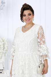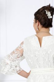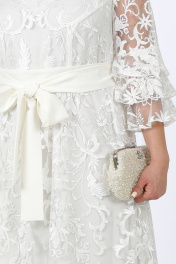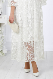7436 Платье женское Это вечернее платье - воплощение элегантности и стиля. Его длина макси придает образу особую роскошь и торжественность. Выполненное из качественного кружева с атласной подкладкой, оно обеспечивает невероятный комфорт и шик. С кружевным платьем идет съемный атласный пояс, который позволяет сформировать правильный силуэт, подчеркивая достоинства фигуры женщин больших размеров. Платье женское, полуприлегающего силуэта, отрезное по линии талии, выполнено из гипюра и костюмно-плательного сатина. Модель без подкладки, с плечевыми накладками. Перед и спинка состоят из двух разных по длине слоев: нижний короче верхнего на 25 см. Перед и спинка лифа с рельефными швами, идущими от пройм вниз до шва. Угол V-образной горловины переда переходит в асимметричный подрез, имитирующий запах. Юбка со сборкой вдоль шва талии. Застежка на потайную тесьму-«молнию» (50 см) расположена в верхней части среднего шва спинки. Рукав длиной ¾, втачной, с тремя воланами по низу. Верхний и нижний слои платья скреплены по всем швам, кроме боковых юбки. Платье комплектуется съемным завязывающимся поясом из сатина. Длина платья (верхний слой)-125 см. Длина рукава-50 см.