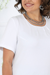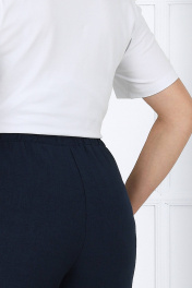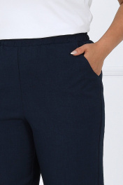 7463 Комплект брючный Брючный костюм тройка - элегантность, комфорт и белорусское качество Жакет прямого силуэта выполнен из костюмно-плательной ткани лён в полоску — смотрится статусно и визуально вытягивает силуэт. Регулируемая кулиса подчёркивает талию и позволяет настроить посадку под фигуру. Рукава с патами дают возможность менять длину, создавая более расслабленный или деловой образ. Брюки из однотонной льняной костюмной ткани с резинкой по всей линии пояса обеспечивают комфортную посадку, не сковывают движения и отлично подходят для женщин больших размеров и для полных. Джемпер из мягкого трикотажного полотна гармонично дополняет комплект — его можно носить как в составе костюма, так и отдельно. Этот костюм — удачное решение, если нужен офисный, деловой, повседневный или нарядный образ, который выглядит дорого и при этом остаётся удобным. Комплект брючный 3-х предметный, состоящий из жакета, брюк и джемпера. Жакет выполнен из костюмно-плательной ткани лён полоска, брюки выполнены из костюмно-плательной ткани лён однотон, джемпер выполненный из трикотажного полотна. Жакет прямого силуэта, с центральной бортовой застежкой с отрезными планками на 7 петель и 7 пуговиц, со стояче-отложным воротником с отрезной стойкой. Длина изделия по центру спинки 73 см от шва втачивания воротника в горловину. Перед с нагрудными вытачками, выходящими из пройм. По спинке и частично по переду настрочена кулиса, в которую втянут шнур. Для регулировки сборки по кулисе на шнур продеты фиксаторы, концы шнура оформлены наконечниками. Рукава втачные, одношовные, с притачными манжетами, застегивающимися на 1 петлю и 1 пуговицу, с разрезами в нижних швах рукавов, с настрочёнными патами, застегивающимися на 1 петлю и 1 пуговицу. Длина рукава с манжетой 62 см. Длина рукава может регулироваться с помощью паты. Жакет с плечевыми накладками. Брюки с посадкой на талии, зауженные к низу, на притачном поясе с резинкой вдоль всего пояса. На передних половинках брюк расположены наклонные боковые карманы. Джемпер прилегающего силуэта. Перед с нагрудными вытачками, выходящими из пройм. Из горловины переда вниз выходят 4 складки. Горловина переда и спинки округлой формы, по переду углубленная. Срезы горловин окантованы косой бейкой. Рукава втачные, одношовные. Длина рукава 26 см.